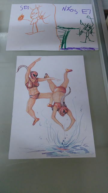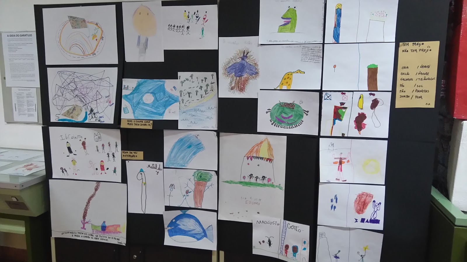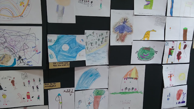 Exposição de desenho infantil a partir das produções dos alunos dos 1º A, 2º A, 3º B, nas AECs de Filosofia para Crianças e Expressões, em articulação com os alunos de ARTES do ensino secundário.